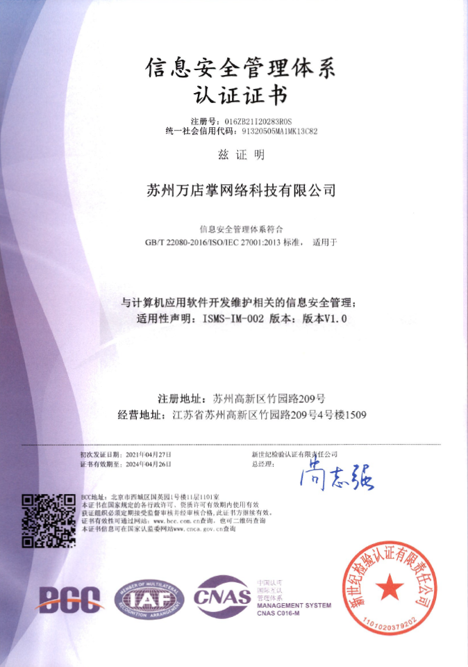 近日,万店掌率先通过信息安全管理体系标准ISO27001认证,该认证是目前国际上最权威、最严格的信息安全标准,这标志着万店掌规范化、安全化的产品和服务达到了行业领先水平,获得了国际权威认可。