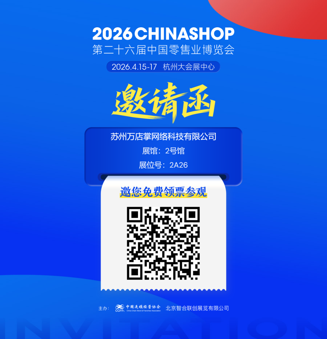 2026年4月15-17日,2026CHINASHOP将在杭州大会展中心盛大启幕!万店掌将携最新智慧零售解决方案重磅亮相【2号馆 2A26】展位!近300㎡全景展区,沉浸式还原真实零售场景,从AI高效运营到全域数据赋能,全方位、立体化解锁零售降本增效核心逻辑,助力企业抢先探索 “服务提质” 新路径!