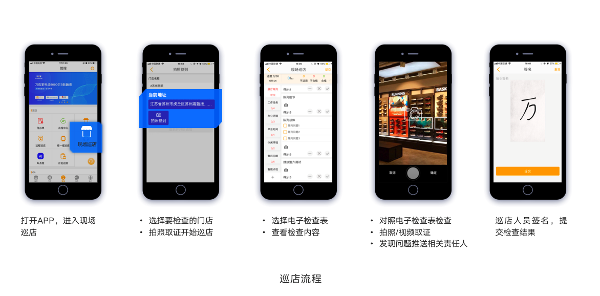 1)督导根据手机定位选择附近门店,现场签到后对照系统统一标准,对商品陈列、门店卫生、营销广告、员工服务等问题项拍照取证;
