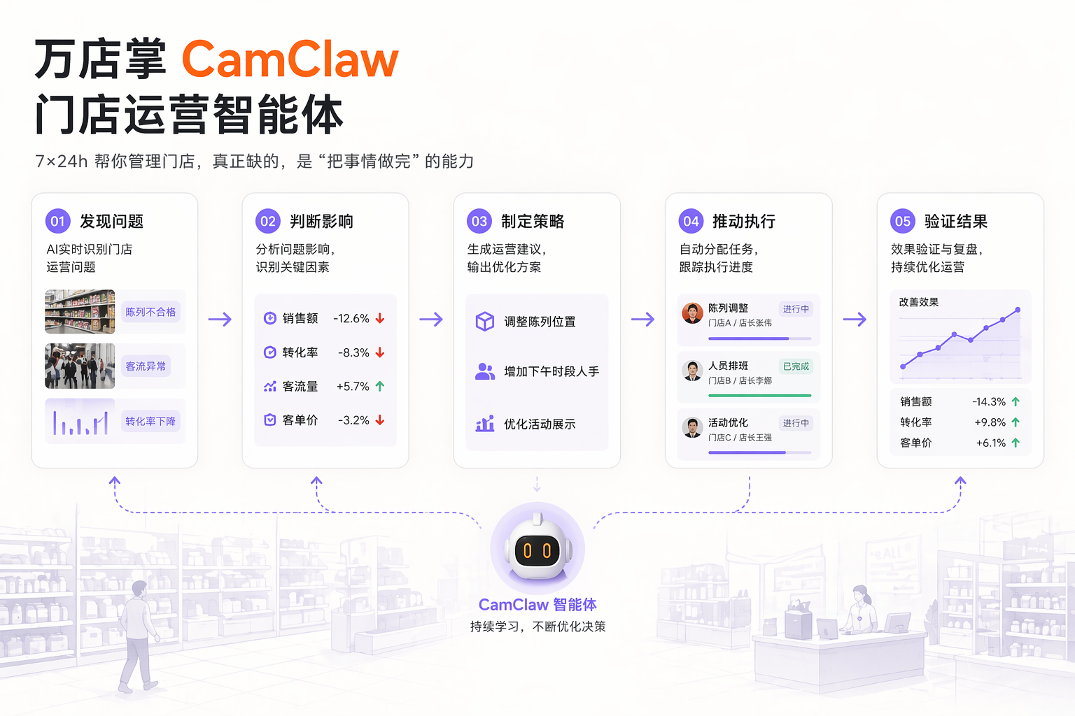 依托万店掌 “AI 驱动 + 专家运营” 双引擎模式,CamClaw 已深度适配零售、餐饮等全业态连锁场景,助力品牌实现全域门店高效管控、风险快速响应,推动连锁经营从 “经验管理” 迈向 “智能决策”,为零售数字化升级注入强劲动力。