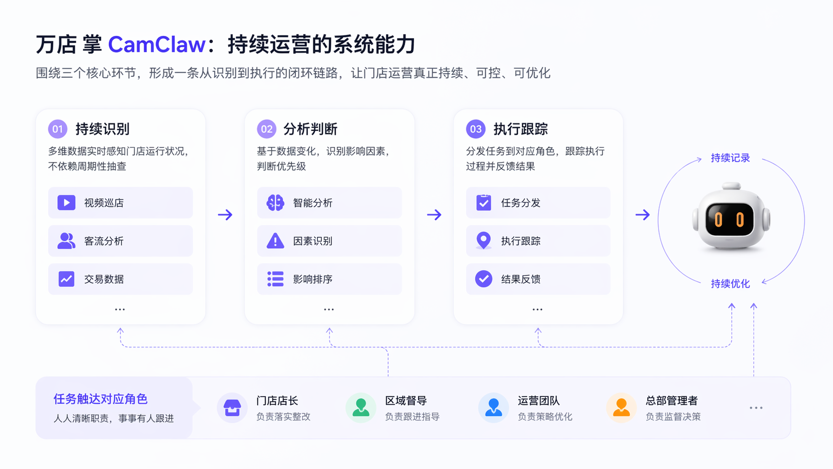 对于千店规模的连锁品牌而言,CamClaw 解决了门店管理分散、滞后、依赖人工的痛点。它让 AI 深度参与经营决策,将标准化管理快速复制到全国门店,降低督导成本、提升执行效率,助力品牌在激烈的市场竞争中实现精细化运营与持续增长。作为零售行业首个门店运营智能体,CamClaw 正引领连锁经营进入 AI 驱动的全新阶段。