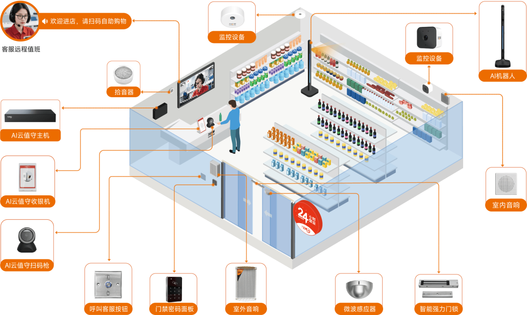 AI云值守,AI实时跟踪顾客行为轨迹,如:识别顾客动作、标记顾客触碰的货架等,助力门店精准洞察顾客需求;云值守客服可通过实时画面,为顾客提供远程咨询、购物引导与应急处理等服务,提升无人时段运营效率。