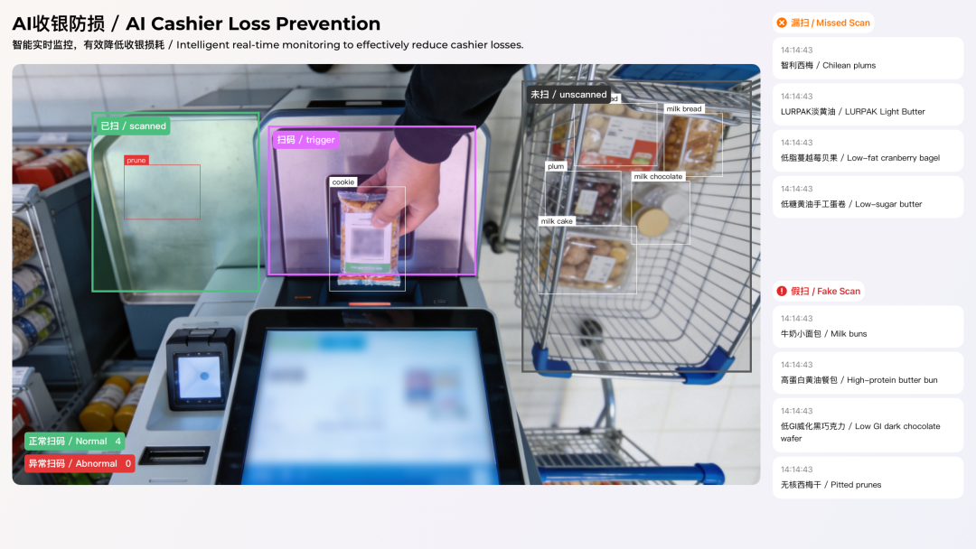 AI收银防损,精准识别自助收银全流程操作,杜绝自助结账时漏扫、假扫等损耗问题,智能完成事件判断与异常告警,降低门店损失,提升收银安全与运营效率。