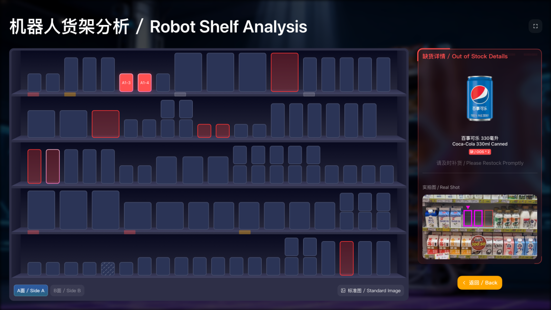 AI机器人,可自主完成门店全场景智能巡查,自动扫描货架、分析商品状态,同步核查价签信息,让门店运营更高效;同时支持主动迎宾、智能导购,有效提升顾客体验,降低人力成本。