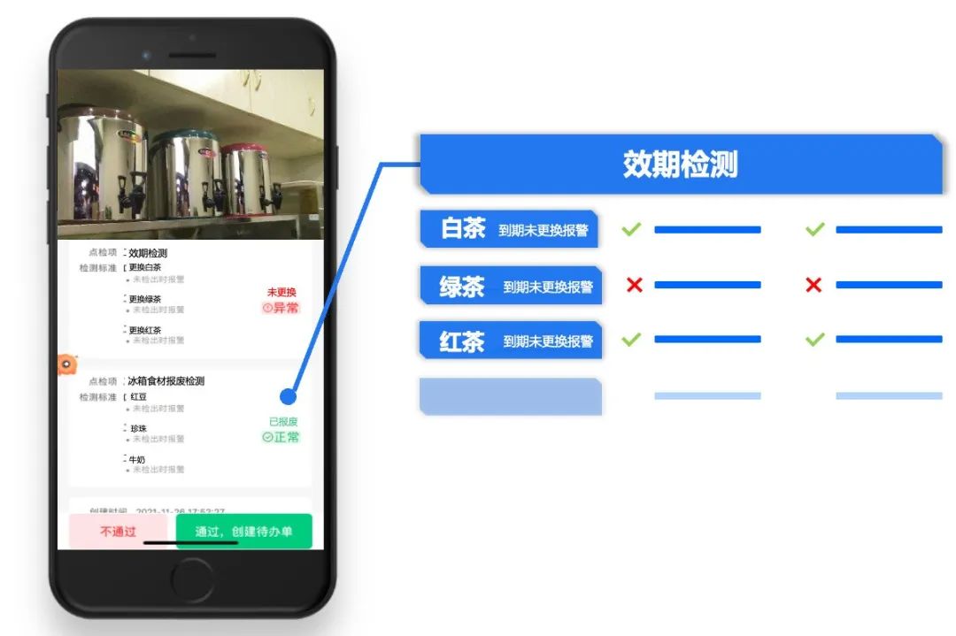 例如,遇到部分餐饮门店违规操作,擅自更换食材效期标签、使用隔夜食材、不戴口罩、员工因培训不到位,或刻意无视总部规定,工具乱放等各类违规行为,万店掌AI巡店系统通过对标准化动作流程进行系统化的采集与标识,再经过各种角度、各种光线下的反复训练测试,可以自动监测规定时间段员工是否有及时更换食材的行为,监督效期临近的产品是否倒入垃圾桶,员工是否有不戴口罩、不穿工服等违规行为,刀具等工具是否放置于规定位置、垃圾桶盖是否按规定关闭等。一旦识别到“触线”行为,立即抓拍告警,并及时将检测结果生成问题待办单推送至门店负责人,确认整改后,系统自动抓取现场图片帮助检查人员进行远程复检。