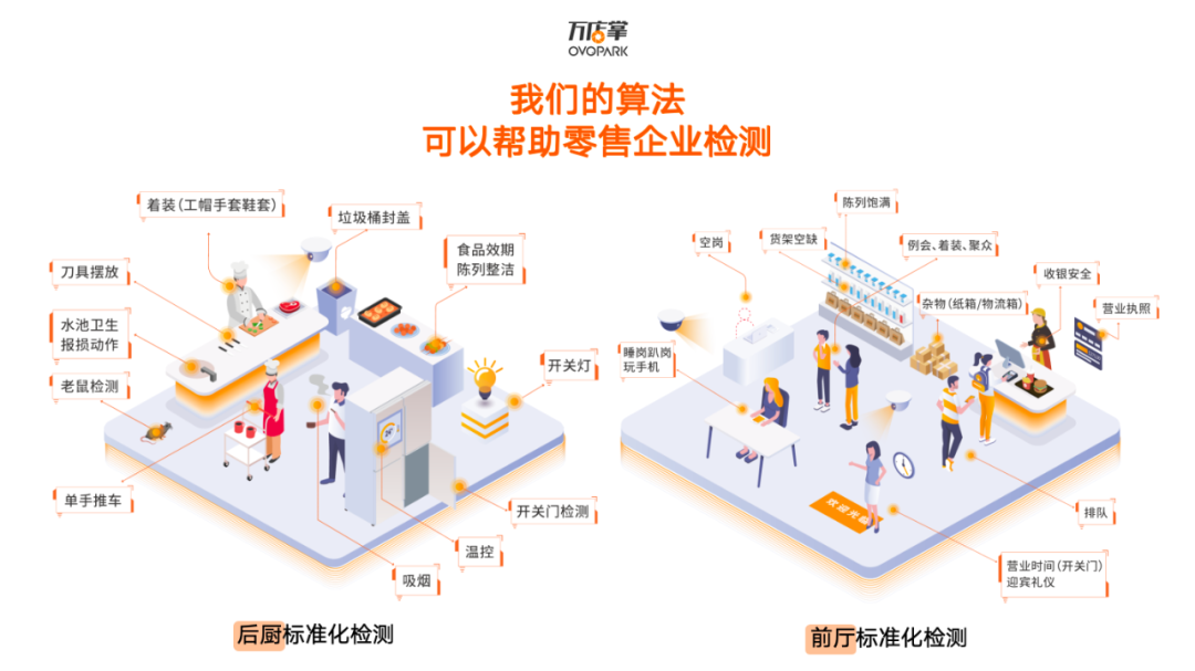 万店掌以AI场景识别+SaaS运营平台为架构基础,构建了高效巡店、神秘顾客、客流分析、AI分析、视频追溯、智能信发、数据分析等针对泛零售连锁企业的全链路数字化管理平台,并针对全行业提供开放平台。