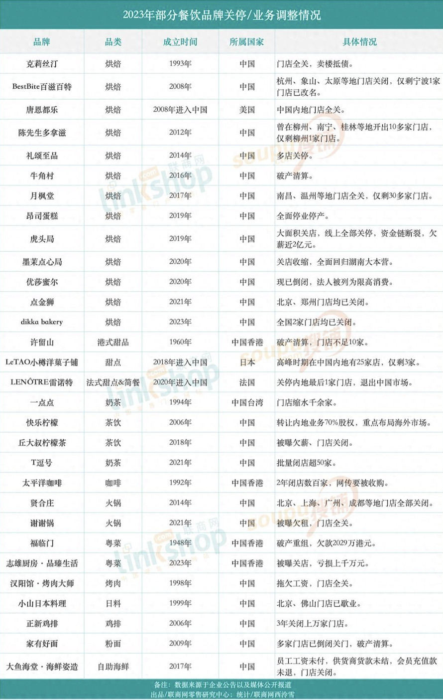 行业疯狂内卷、低价团购兴起、价格战不断、洗牌加剧,等等。新势力餐饮品牌狂冲猛进,冲击万店,抢夺加盟商,却也有大批老牌餐饮倒闭破产、拖欠工资、闭店歇业。2023年宣布倒闭或调整的品牌中,既有昂司蛋糕、牛角村、丘大叔柠檬茶、谢谢锅等曾经的一线网红餐饮品牌,也 有克莉丝汀、 快乐柠檬、福临门、汉阳馆·烤肉大师等老牌餐饮品牌,也包含雷诺特、LeTAO小樽洋菓子铺等海外餐饮品牌,还有各种老牌酒楼、地方餐饮品牌,倒闭歇业的可谓多如牛毛。