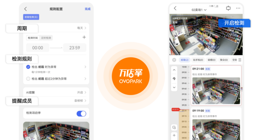 规则配置直观易懂,用户可以设置检测时间段(如仅营业时间开启)、是否开启AI提醒以及指定接收提醒的成员等。