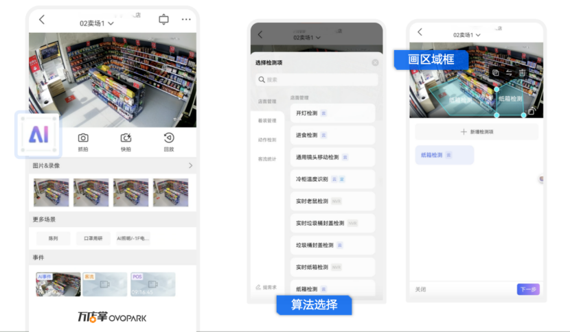 在万店掌AI后台,用户可以通过直观的可视化界面完成检测配置。只需要在摄像头实时画面上用鼠标拖拽,就能划定需要AI关注的区域。