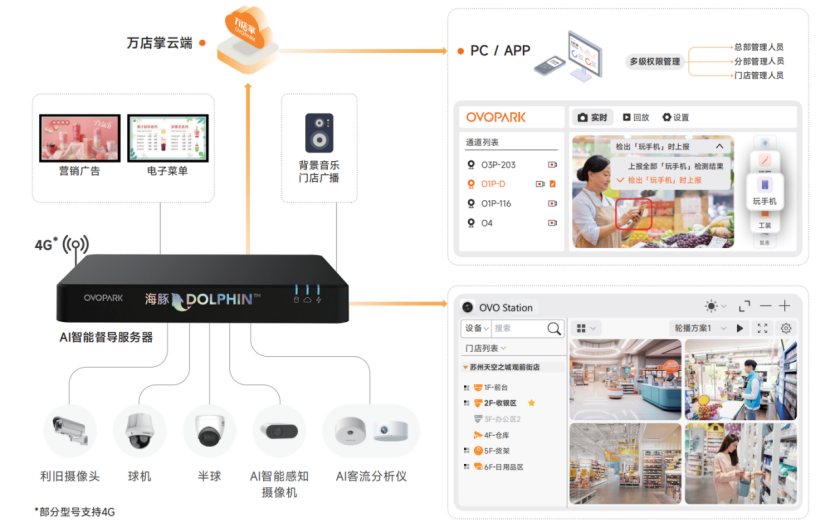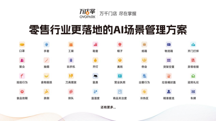 万店掌以AI场景识别+SaaS运营平台为架构基础,构建了高效巡店、神秘顾客、客流分析、AI分析、视频追溯、智能信发、数据分析等针对泛零售连锁企业的全链路数字化管理平台,并针对全行业提供开放平台。