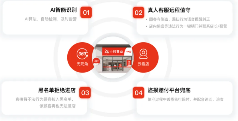 2. 真人远程干预:值守客服实时监控,发现异常(如未成年人买烟、漏付商品等)立即语音警示并留存证据,重大险情联动店主或公安,并可设置黑名单,标记顾客无法进店。