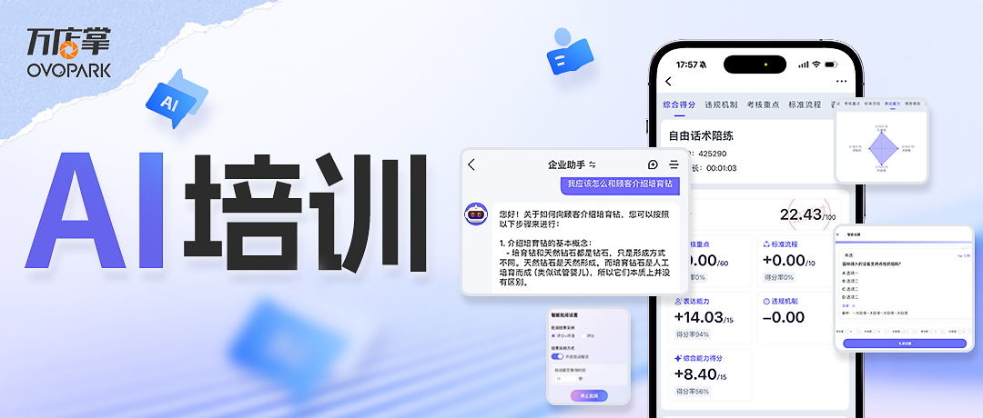 万店掌AI培训,融入人工智能和大模型技术,全面重构线上培训全流程,轻松完成“学-考-练-用”一体化闭环,精准赋能一线业务,为零售行业带来全新员工成长解决方案。